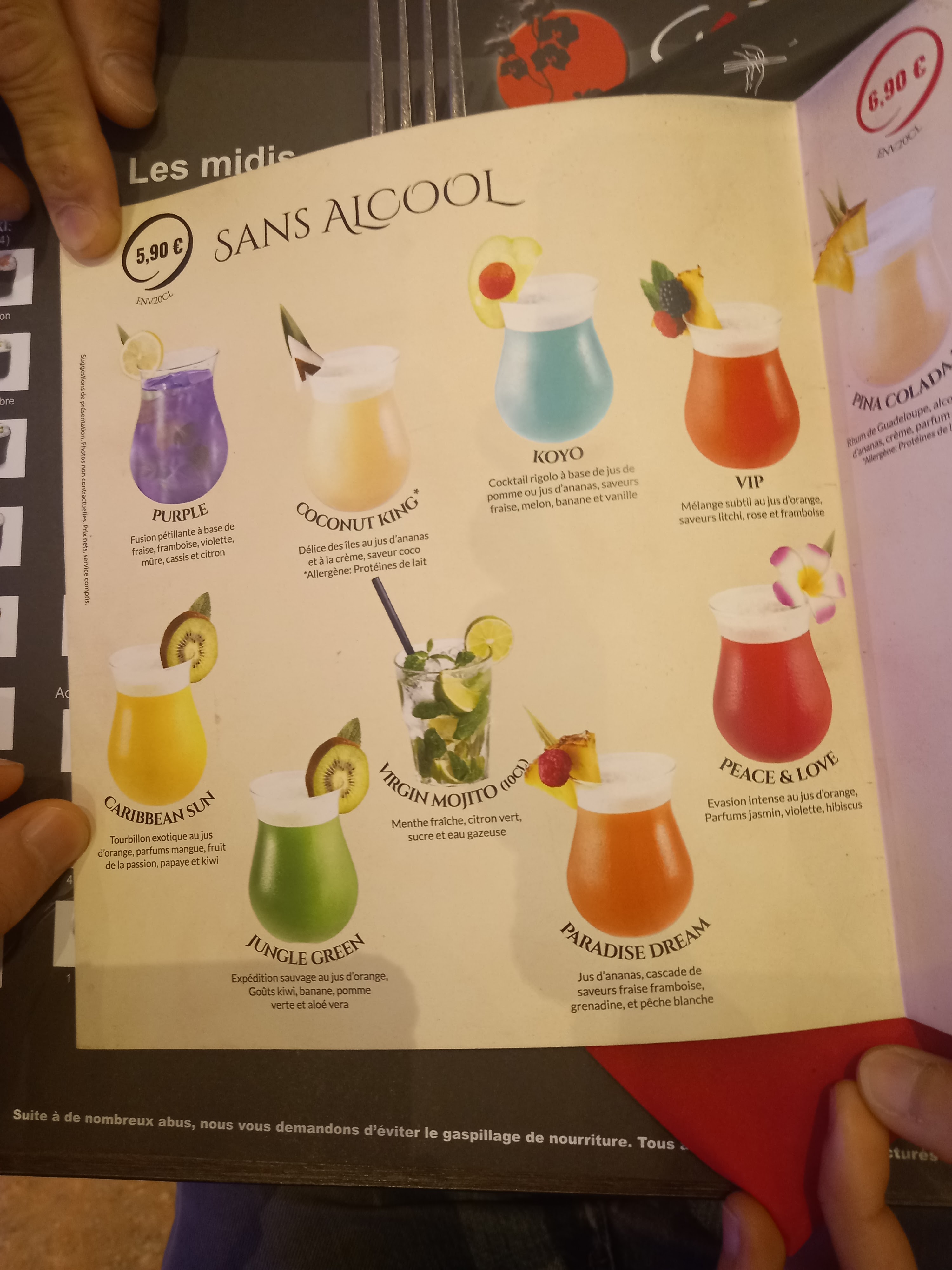 Typique resto a volonté japonais qui n'est pas tenu pour des Japonais. Disons que si vous voulez vous gaver (comme mes enfants en pleine crise de croissance..) ça va, mais on est loin d'une qualité gustative au top. On y va principalement pour faire plaisir aux enfants. Ah oui, le petit détail, les anciens tarifs masqués au stabilo noir qui permet de voir que le menu s'est prit deux euros d'augmentation.