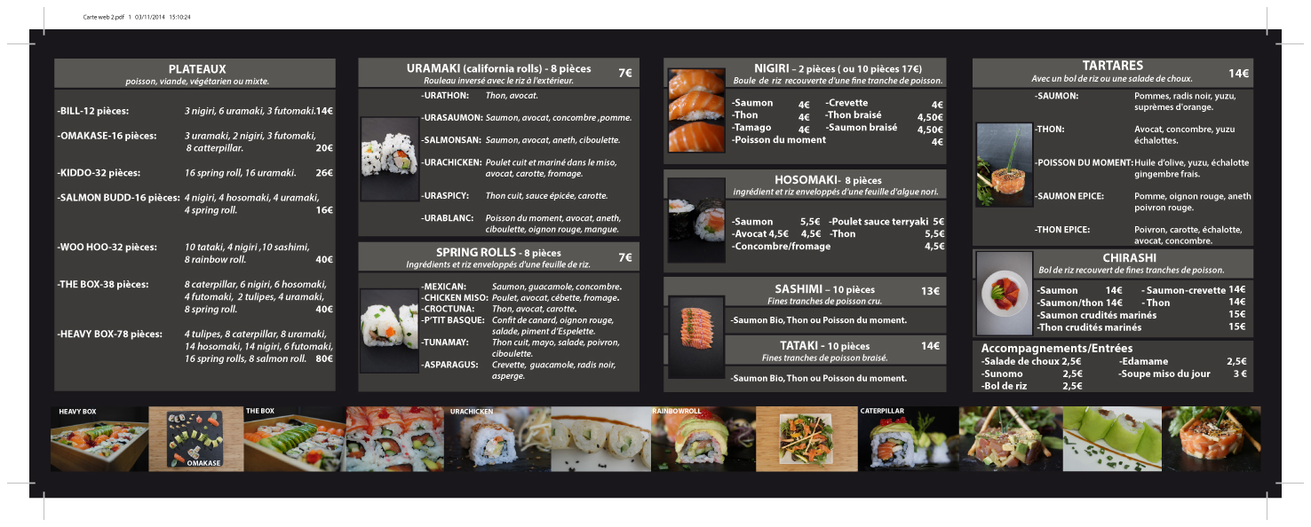 Posté le 17/03/2017 à 15:09"Un vrai délice ! Un personnel agréable, toujours prompt à faire des blagues et à vous donner le sourire. Des mets délicieux et frais. Une variété assez intéressante au niveau de la carte. Des prix classiques pour un restaurant japonais. Attention : la carte actuellement en ligne (novembre 2017) sur leur site internet correspond à l'ancienne carte des menus. Elle a été légèrement modifiée. Que dire de plus, mis à part que j'y retournerai sans hésitation ?"