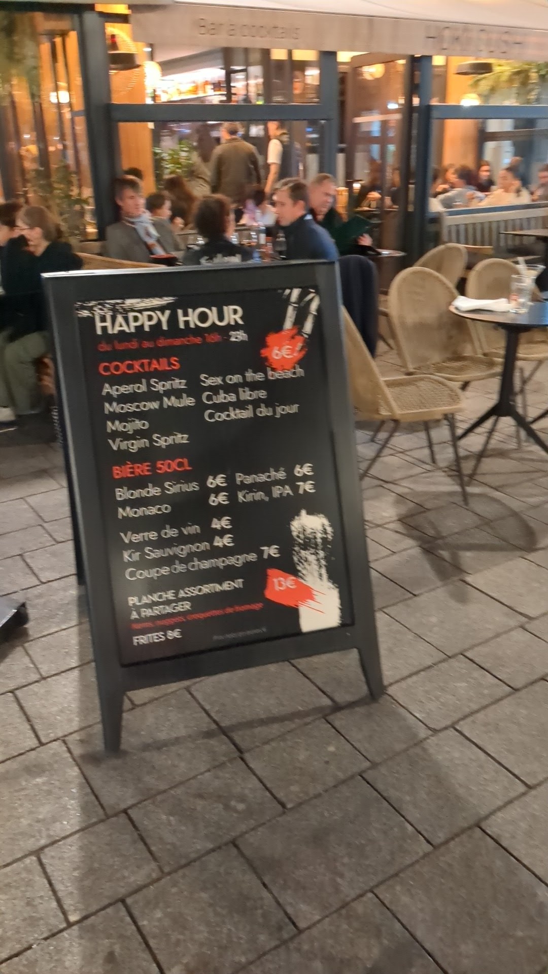 Happy hour à 6 euros de 16 heures à 20 heures sur de nombreuses boissons (cocktails et bières). Terrasse très agréable et intérieur propre et très bien décoré. Service vraiment rapide. Je n'ai pas eu l'occasion d'y manger mais je prévois d'y retourner.