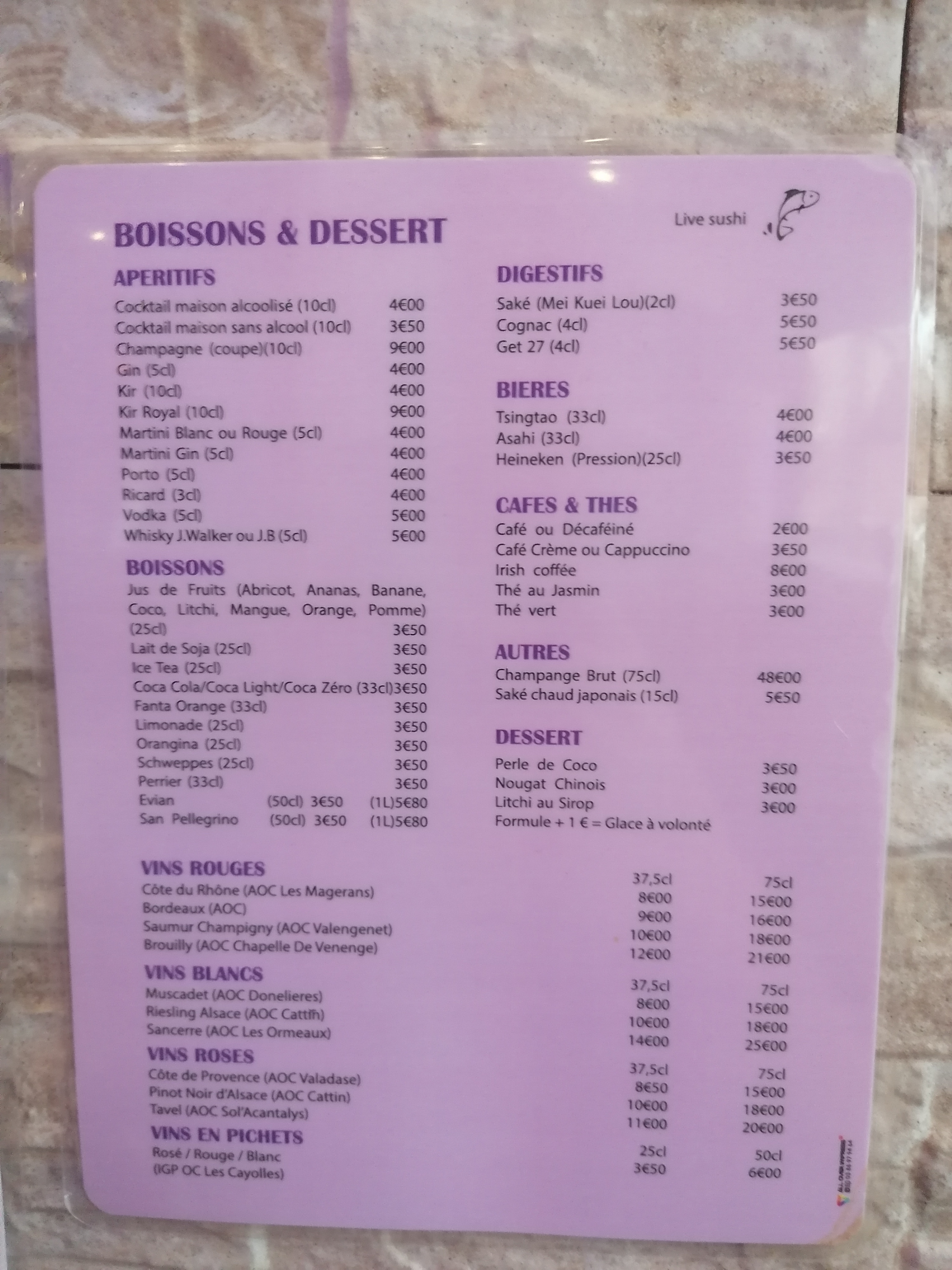 Posté le 04/11/2022 à 11:00"Oyé Oyé! Avis à la population!!! Le restaurant Live Sushi est absolument à visiter si vous voulez être mal accueilli, mal servi, et manger de la nourriture que même un canidé ou un bovin ne mangerai pas! A peine assis, on nous presse (comme des citrons) pour savoir si nous avons choisi. (Évidement non) Les serveuses sont encore moins aimables que des portes de prisons... 2 Min après avoir passé commande, nos plats chauds sont arrivés tous en vrac dans la même assiette (très appétissant...) Évidement beaucoup trop rapide pour une quelconque préparation. Pour ce qui est de la spécialité d'un restaurant dit Sushi, il nous était impossible de distinguer (au gout) le saumon, du thon, de la dorade et du riz... De plus le riz était ultra compacté, même des sardines en boites ont plus de liberté! Je savais que je mangeais dans un à volonté, mais j'ai connu BIEN mieux (et aussi à volonté) ailleurs de nombreuses fois. (Pour le même prix) Si vous y allez quand même, je vous recommande le jus d'ananas, le seul truc potable de l'établissement. Bisous"