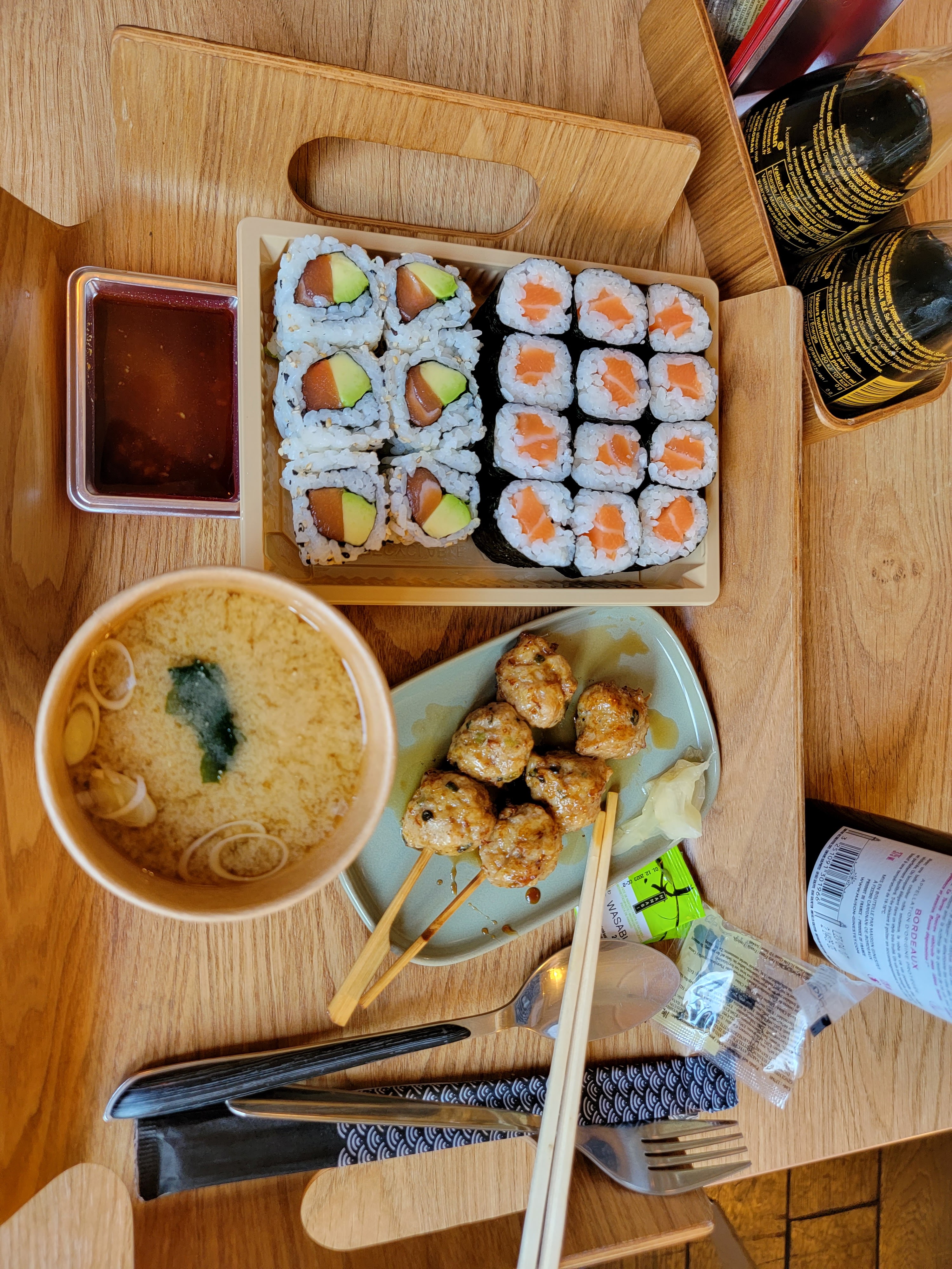 Posté le 18/08/2022 à 16:11"Nous avons mangé sur place. Le restaurant est propre et bien agencé. Nous avons été servi dans des emballages à emporter. Impossible de boire la soupe miso avec une cuillère en bois. Les boissons ont été servi après le repas. Pas de sauce soja sucré. Très dessus du service."