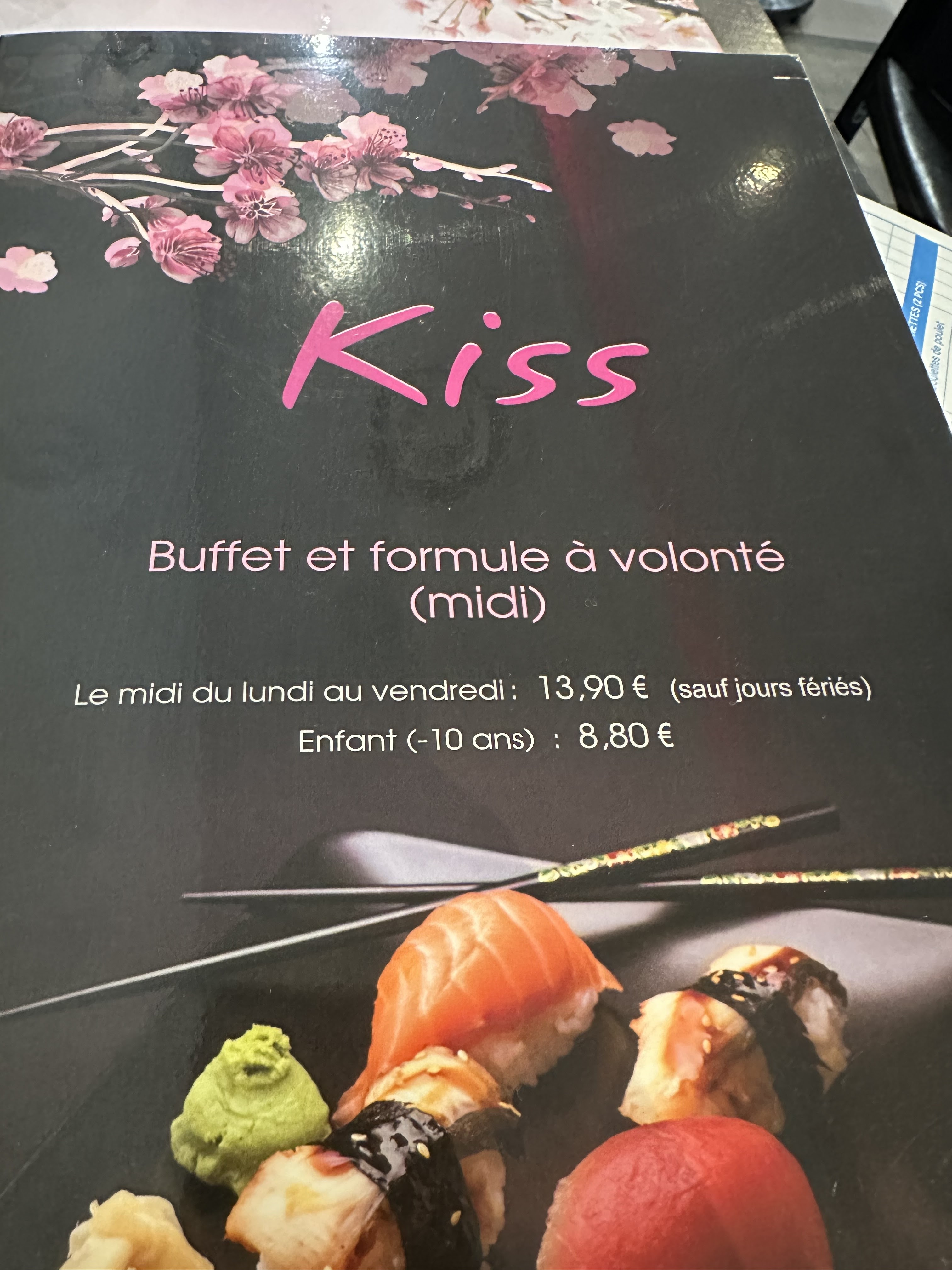 Posté le 15/03/2019 à 12:42"Foncez les yeux fermés ! Les sushis/makis sont tellement hors de prix dans les autres restaurants, vous payez à la pièce et souvent la fraîcheur n'est pas au rendez vous. Arrêtez tout et venez manger chez Kiss !! Ici toute la carte de makis/ sushis / brochettes et à volonté, préparé à la commande et apporté à votre table. Il y a également un buffet de spécialités chinoises et des glaces en dessert. Pour moins de 15€ le midi vous pouvez vous régaler et combler votre envie de sushis. Essayez d'arriver en dehors des heures conventionnelles de repas, le restaurant est victime de son succès et la queue peu parfois déborder jusque sur le trottoir"