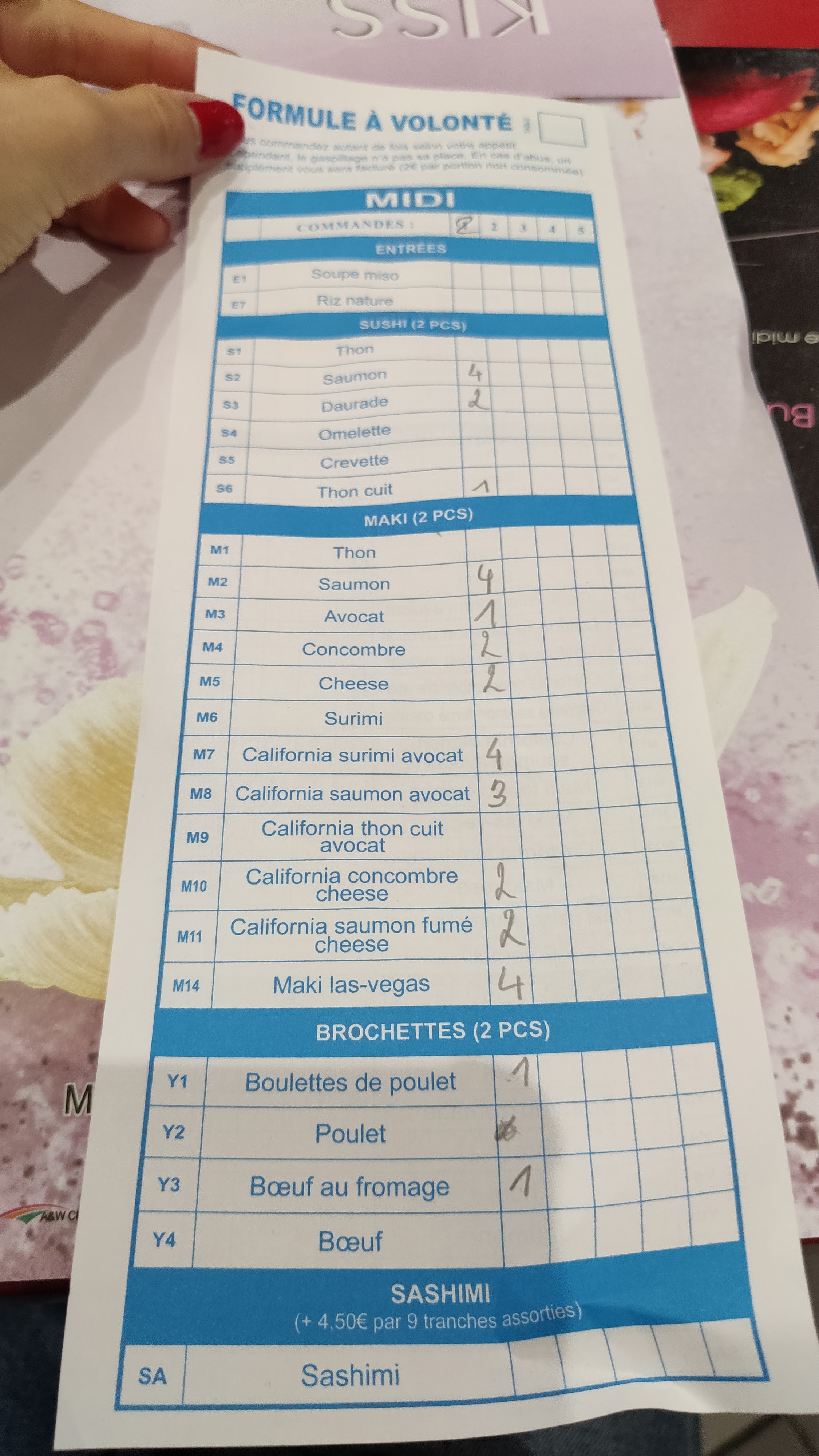 Posté le 13/06/2024 à 17:08"J'ai bien aimé le service pour les sushis et les brochettes, on vous amène une liste avec toutes les sortes de sushis et de brochette et c'est vous qui remplacez sur la fiche la quantité que vous voulez, comme ça tout est fait sur le moment et pas de gaspillage 👌 Le reste du buffet était également très bon 😍"