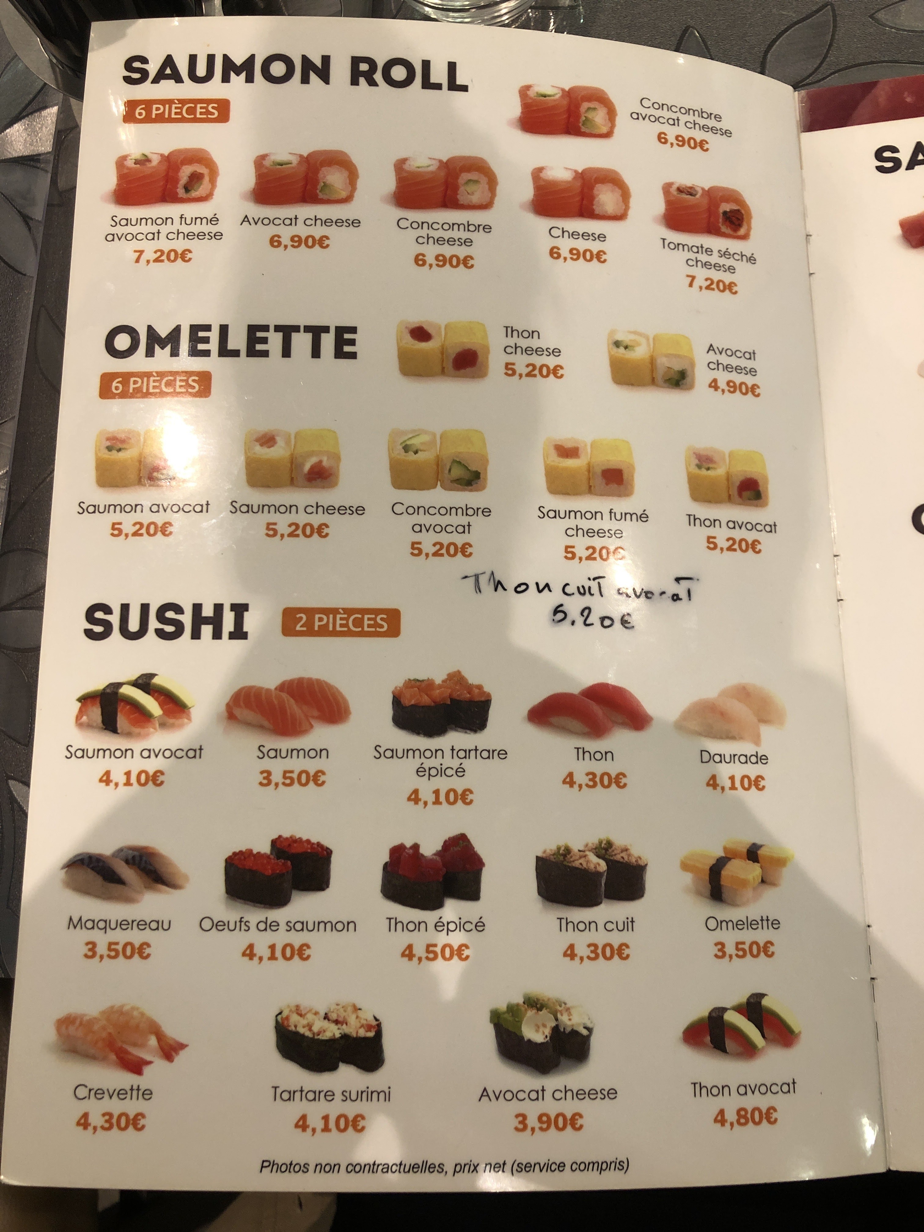 Posté le 06/08/2020 à 19:13"Les sushis sont bons mais décevants : Le saumon ne fait pas tout le tour, de plus j'avais commandé bavec du cheese, il n'y avait quasiment rien dedans, même en l'ouvrant."