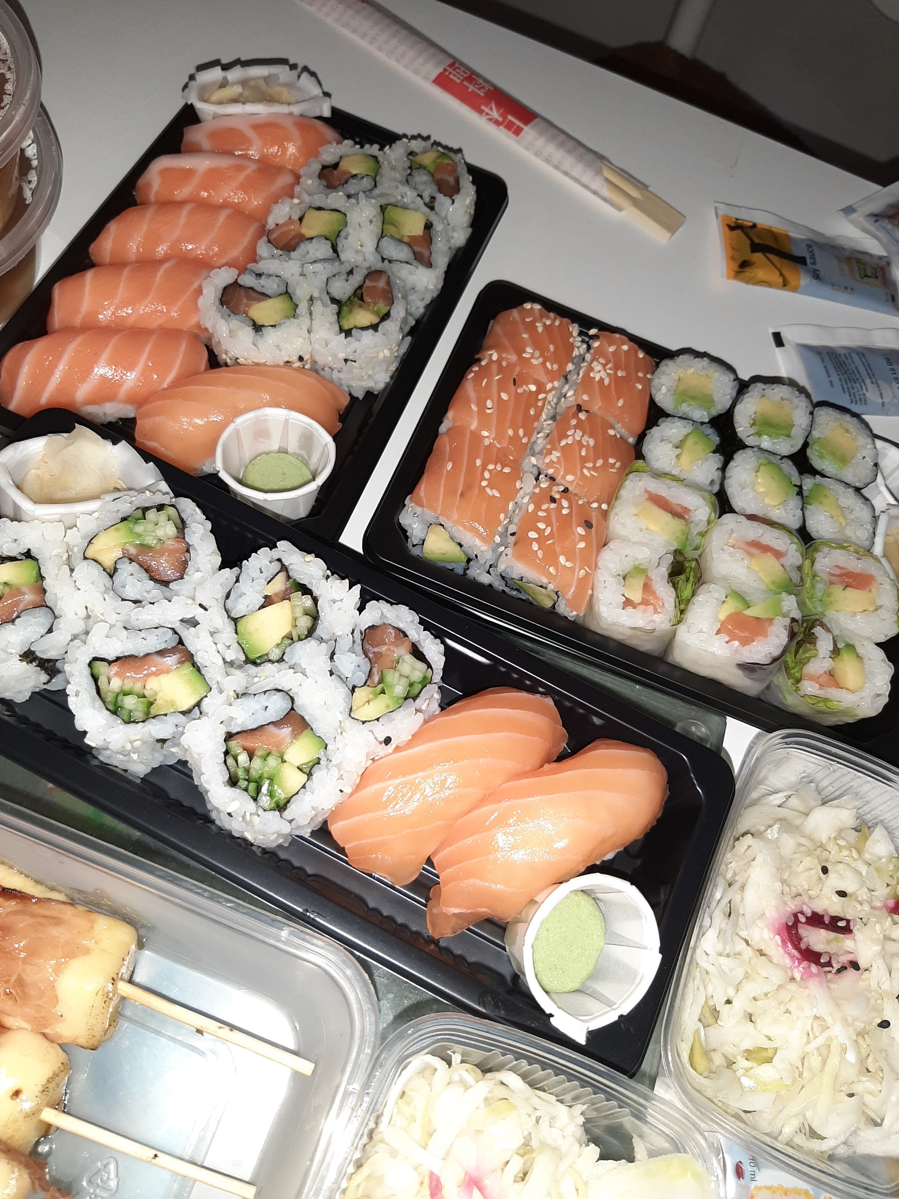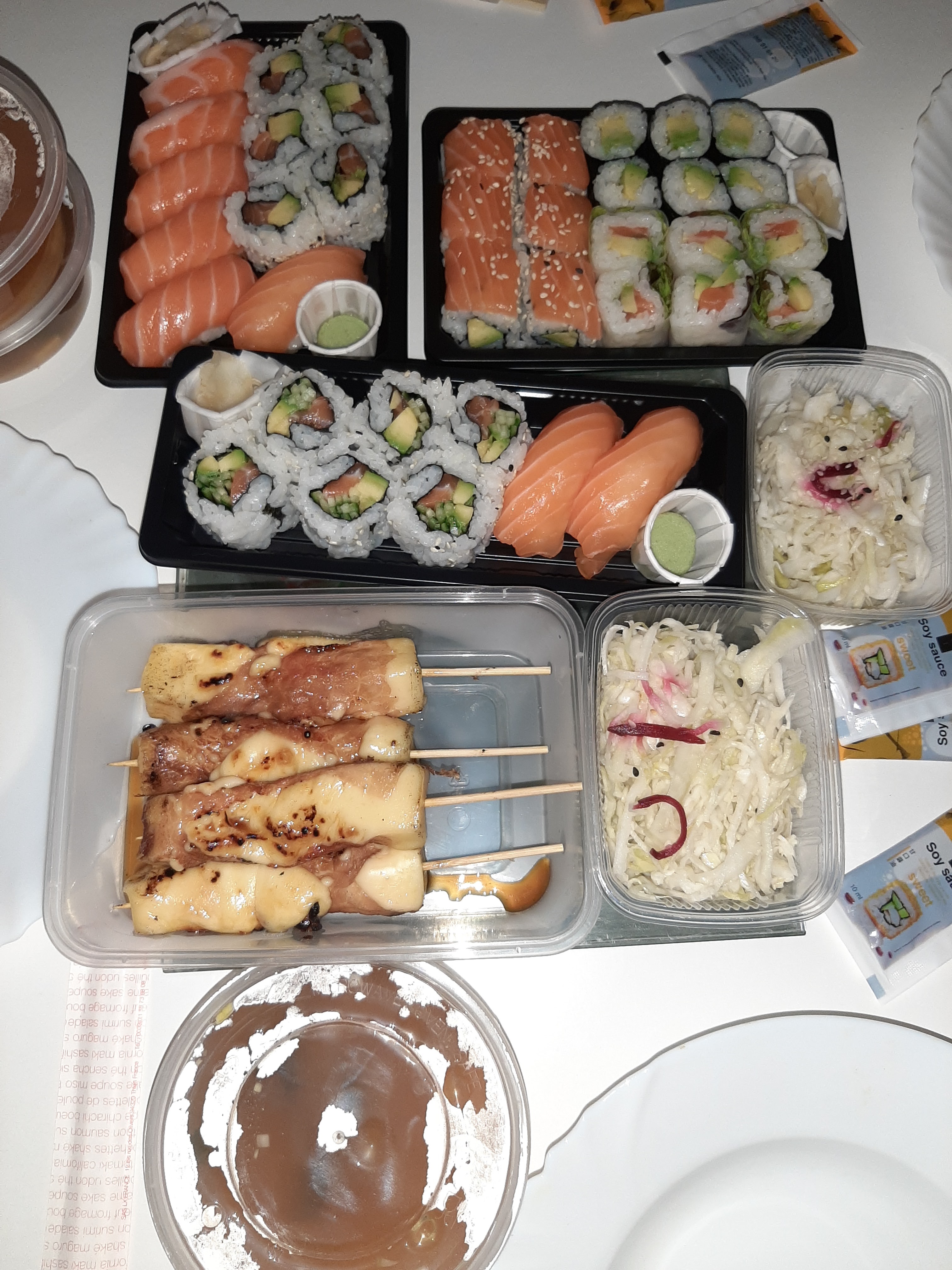 Posté le 02/04/2022 à 04:53"Sushis au saumon sans goût...Idem pour les makis..salades de chou pas top... Seules les brochettes de poulet étaient plutôt bonnes."
