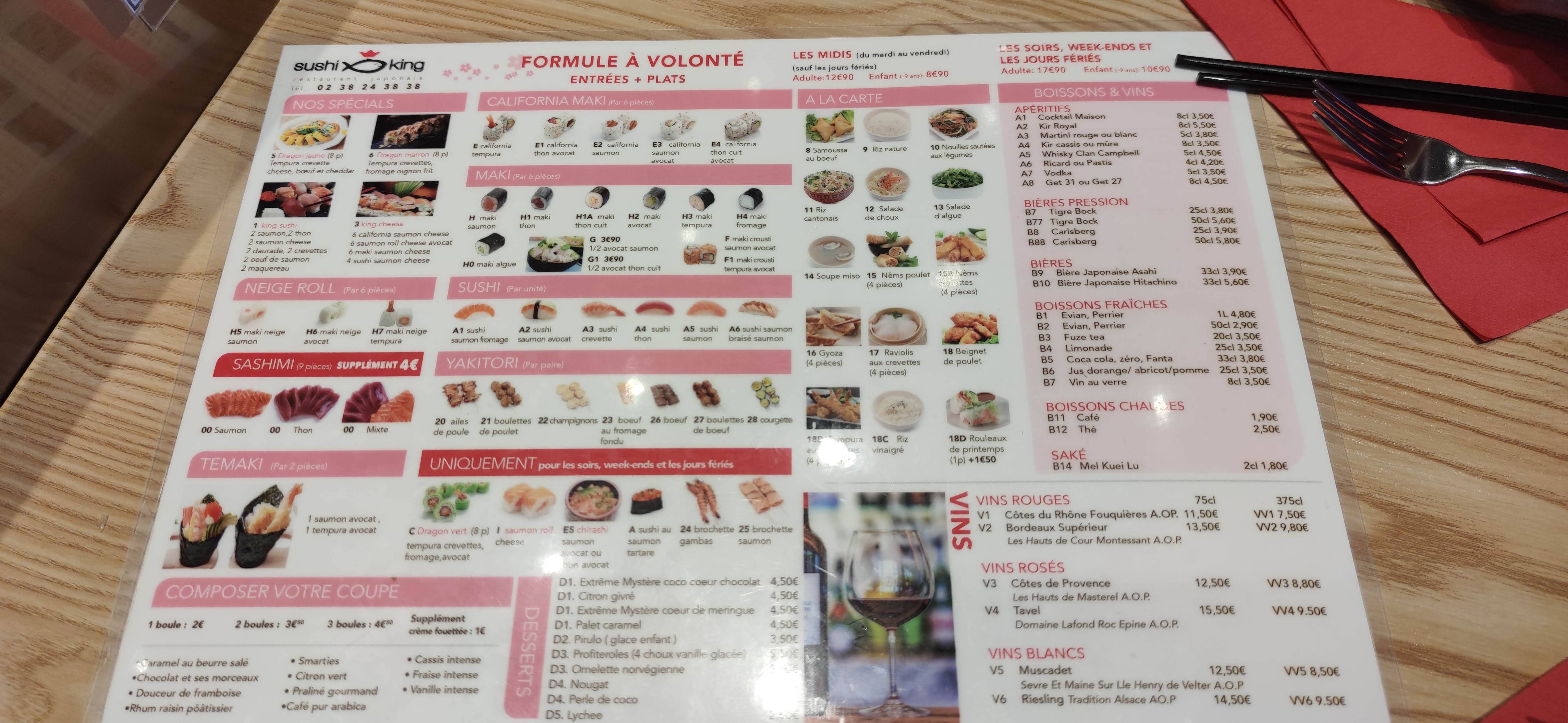 Posté le 15/11/2023 à 18:32"Après avoir passé 5 ans à Paris, à profiter des nombreux buffets chinois et japonais, j'ai déménagé à Orléans. Et il est difficile de trouver de bons buffets à volonté japonais à Orléans : Sushi King a été une excellente découverte ! :) Enfin un buffet qui fait vraiment griller les yakitoris/brochettes ! Les bouchées de crevette vapeur sont très bonnes, les sashimis et les brochettes aussi. Le poulet à la citronnelle est également très bon. Les makis sont généreux, mais sans être bourrés de riz, et le riz est bien cuit sans être collant ou bourré de flotte. J'ai été très déçue de mes dernières visites chez les concurrents : soit car baisse en qualité sur les makis, soit les plats chauds ne sont pas bons, ou forte hausse des prix. Donc Sushi King sort vraiment du lot avec un joli décor, un service au top (bravo à l'équipe car la salle est grande et il y a énormément de couverts à servir chaque soir), et les plats proposés sont bons et bien présentés. Mon nouveau buffet à volonté préféré :). Seuls défauts : je préfèrerais que les gyozas ne soient pas frits, mais plutôt vapeur et très légèrement grillés sur le dessous. Et je rêve de voir un ou deux desserts proposés dans le buffet, comme des makis crêpes/banane."