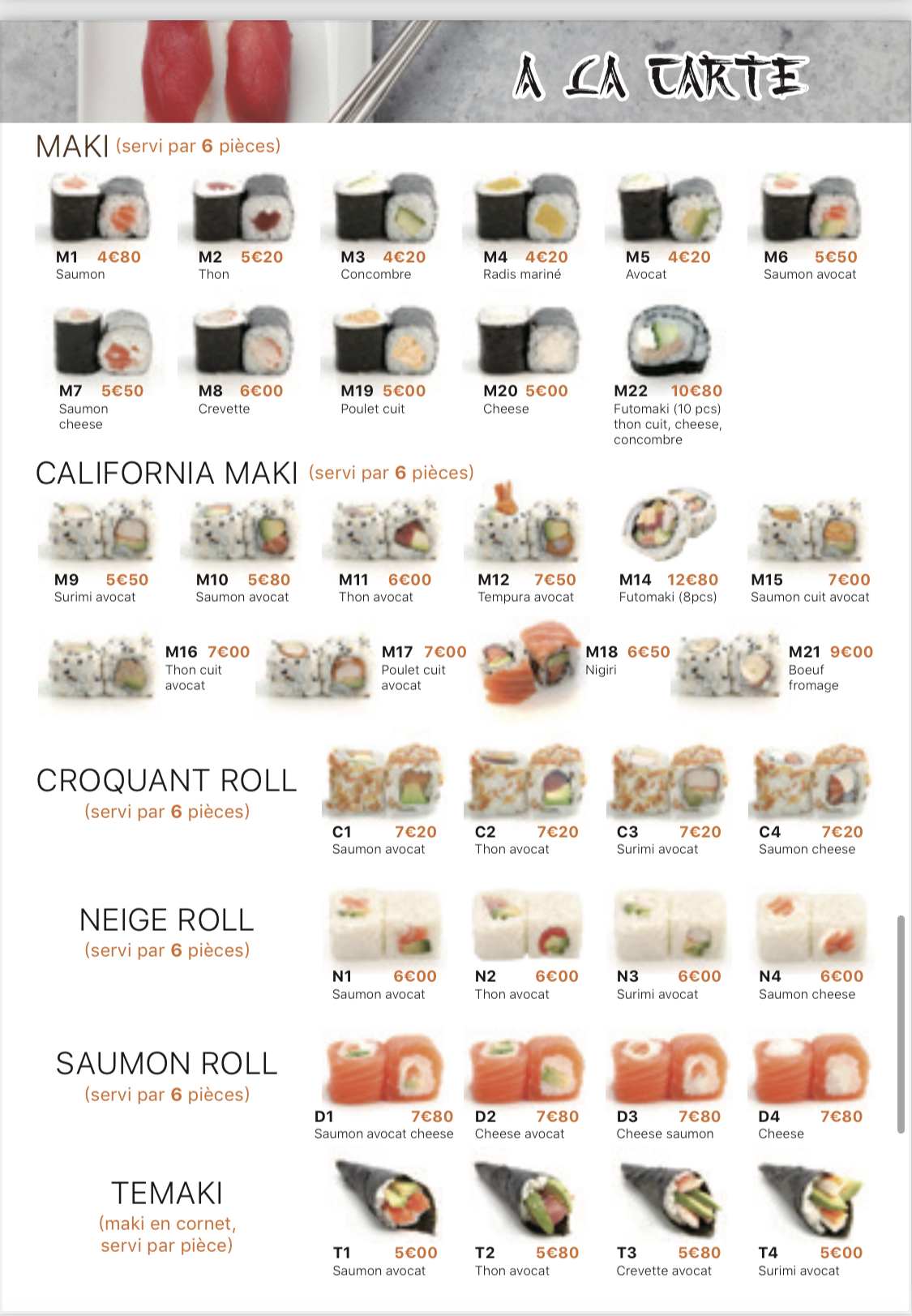 Le poisson est je très bonne qualité .si vous voulez mangé des bons sashimi maki etc n hésitez pas .Les produit sont frais .Ils ne comprennent pas encore tous bien notre langue mais ça ne les empêche pas d être efficace et agréable .pour être livré dans trop D attente commander dés l ouverture .la prise de commande est très efficace également avec le système de codage .bref je recommande.