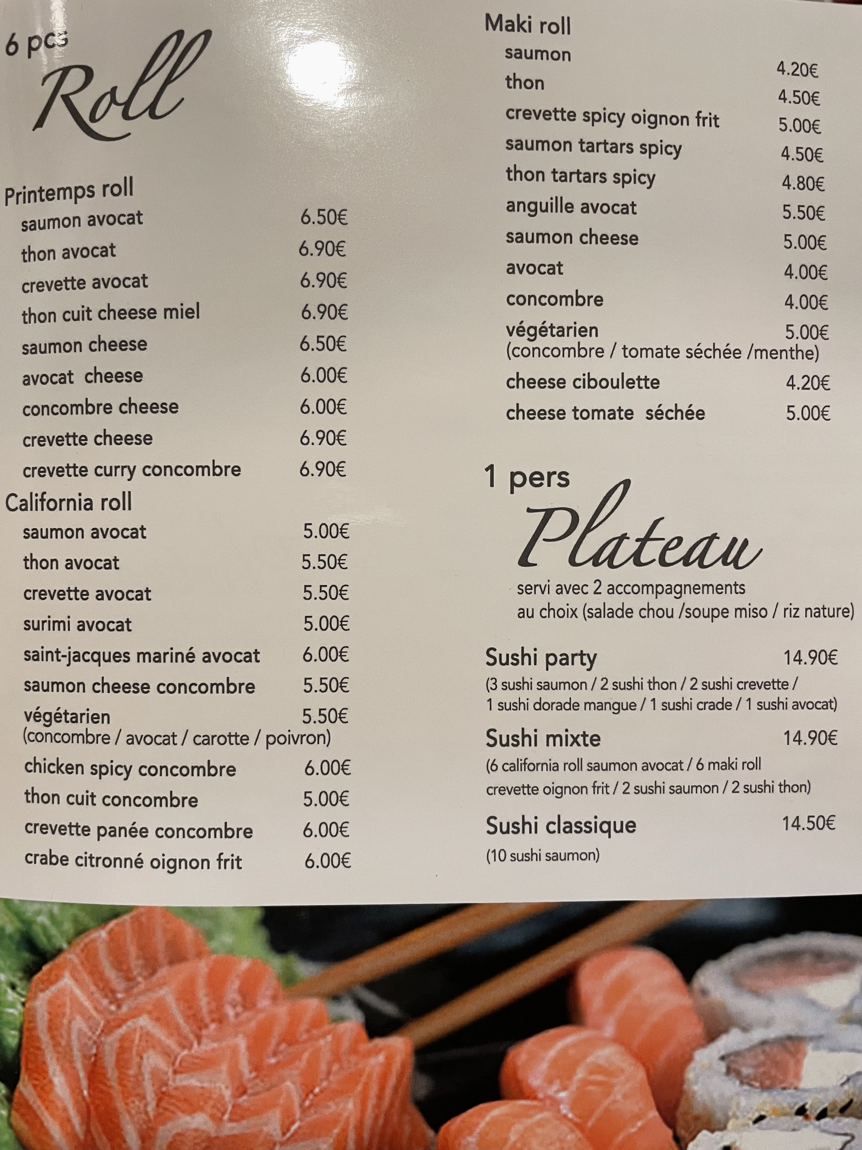 Posté le 21/01/2023 à 18:58"Excellent sushi ! Très bon rapport qualité prix. Le menu du midi est entre 11,9 euros et 13,9 euros avec accompagnement soupe et salade."
