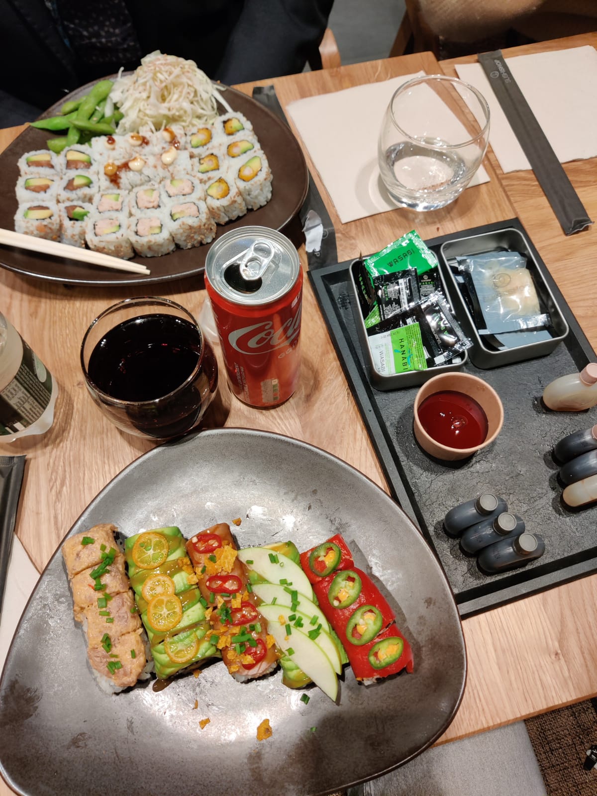 Qualité des sushi pas terrible, servi à table dans une barquette au lieu d'une assiette La tablette pour commande pas pratique quand on est 2 Presonnel(le) et restaurant bien et sympathique Pas de suivi sur le service client