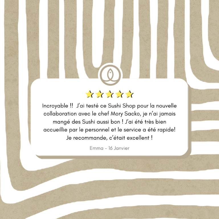👌 Parfait à tous points de vues. Organisation, service impeccable, bon accueil en boutique, bonne gestion des commandes par tel comme par l'application mobile ou le site (très peu d'erreurs). Rapidité, exactitude et fraîcheur préservée pour les livraisons👍 Amabilité, écoute et respect du client 😊Les ingrédients sont de haute qualité, très bien préparé, très soignés, alléchants et raffinés (C délicieux 😋), avec une excellente hygiène, ce qui est primordial avec des produits consommés crus👍 Les prix sont onéreux mais sont en proportion d'une telle exigence de qualité et d'originalité de présentation et de goût 🍱 Mais il est prévu des récompenses pour les clients fidèles et assidus 👏 Bref, à faire et voilà ❤️