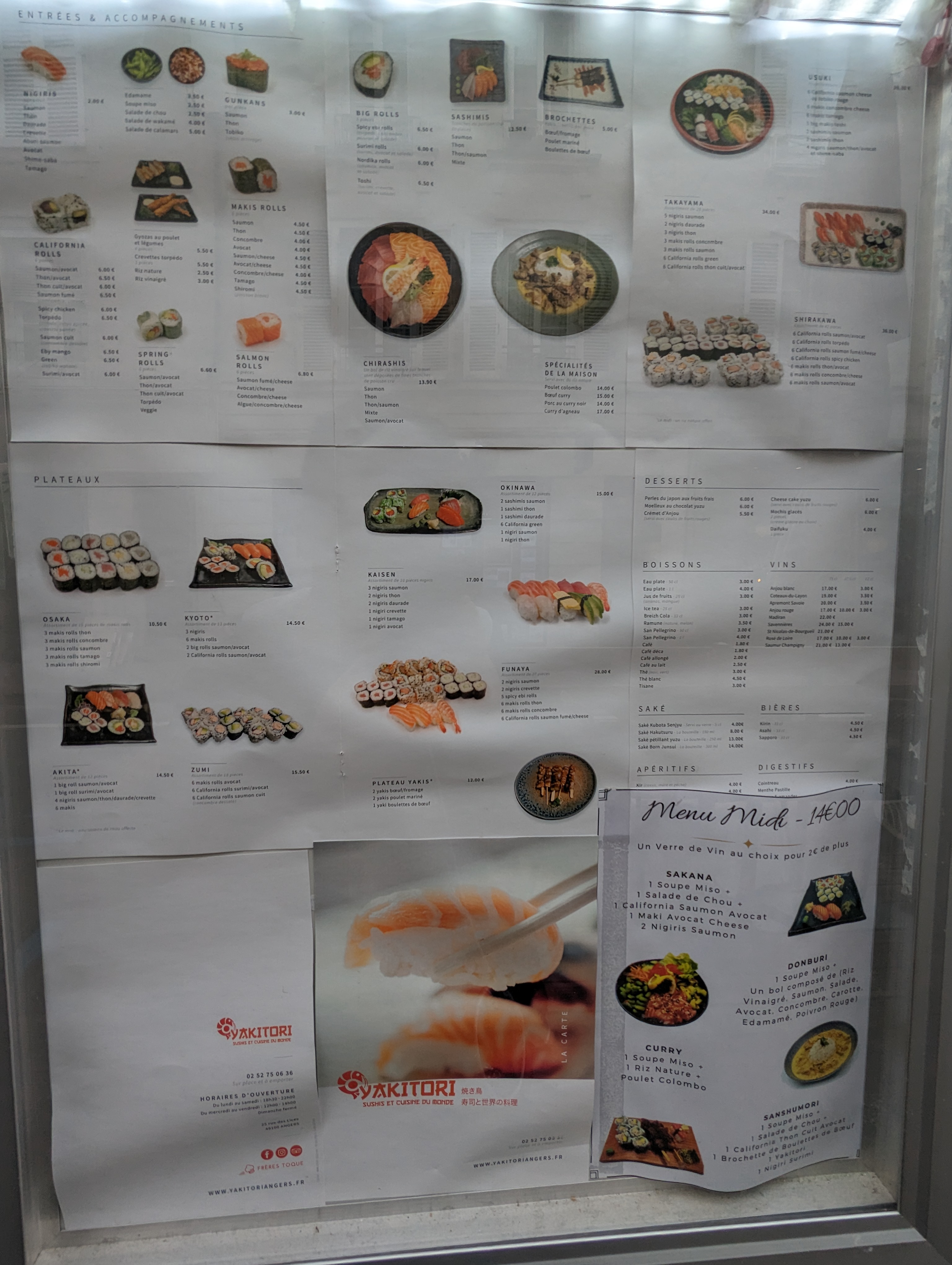 Nous avons fait 2 repas à yakitori, excellents raviolis au poulet, avons bien apprécié aussi les tempura de crevettes et les brochettes de porc et poulet et très bons makis saumon et t Hon